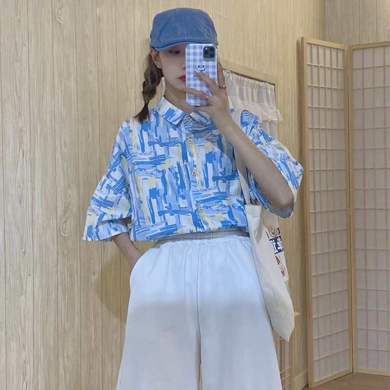米和由蓝色短袖花衬衫女设计感小众盐系复古港风上衣夏季薄款衬衣热门设计联盟服务商