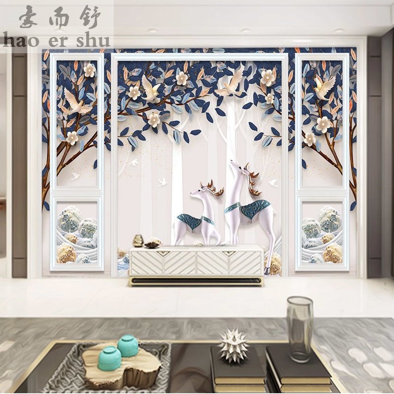北R欧几何沙发卧室客厅电视背景墙壁纸麋鹿影视墙壁画装饰无缝墙热门设计联盟服务商