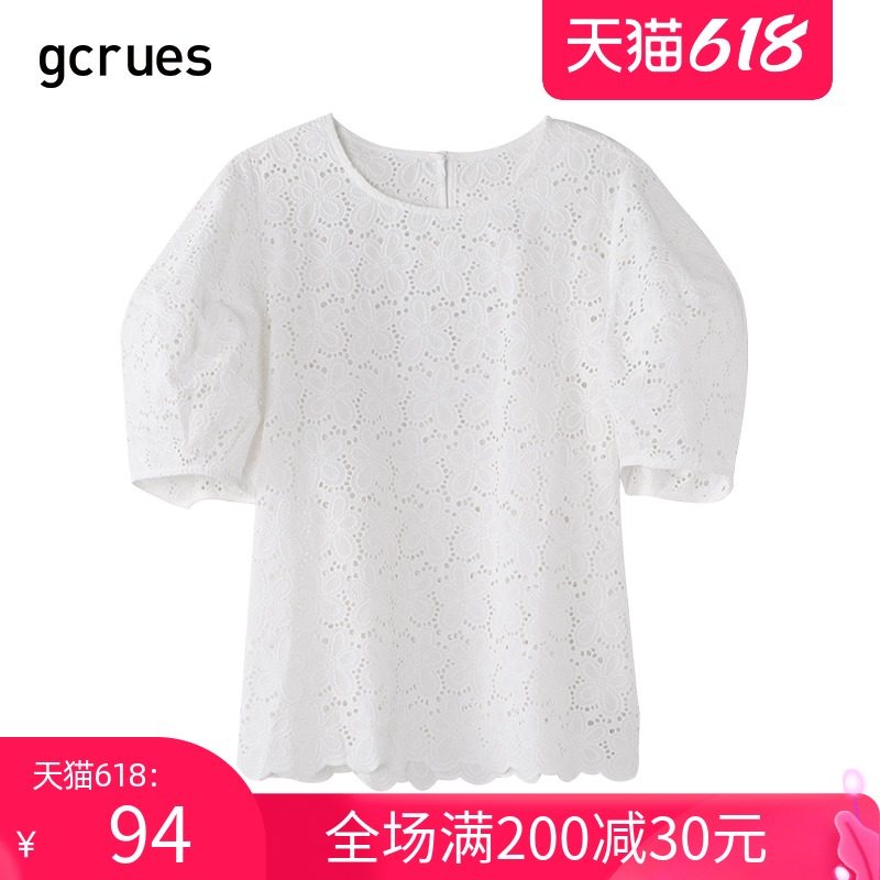 gcrues镂空刺绣白色衬衫女时尚夏季新款圆领上衣泡泡袖小衫设计感热门设计联盟服务商