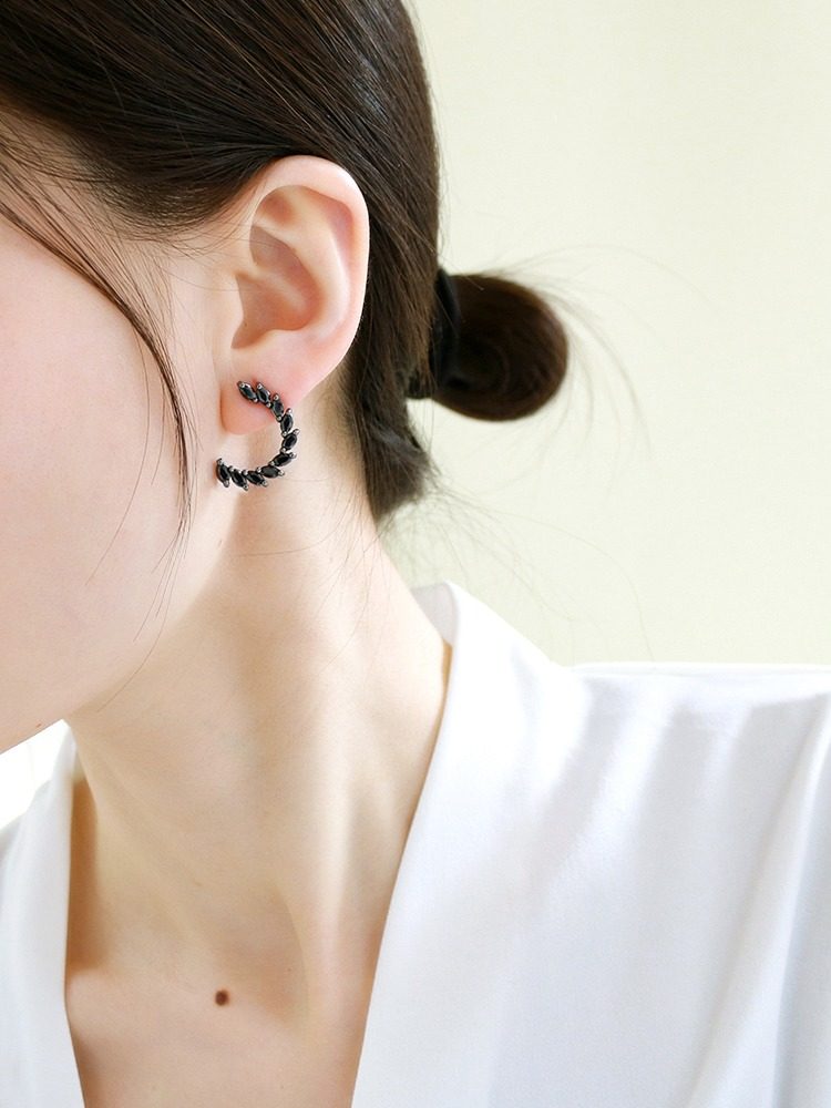 小众日韩镶黑色锆石橄榄枝C型设计耳钉耳环925银针简约潮耳饰热门设计联盟服务商